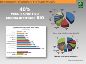 L’Italia nasce nel bio come paese esportatore e anche gli ultimi dati ci confermano la rilevanza delle esportazioni per il mercato biologico italiano, con un giro d’affari di 1,6 miliardi di euro aggiornato al 2015.
